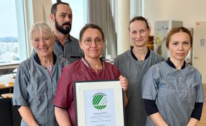 Leder af kantinen på Viborg Rådhus, Christina Tollak (i midten), sammen med kolleger ved modtagelsen af Svanemærket. Bag Svanemærket-diplomet ligger en stor og målrettet indsats af personalet i rådhuskantinen. Foto: Viborg Kommune.