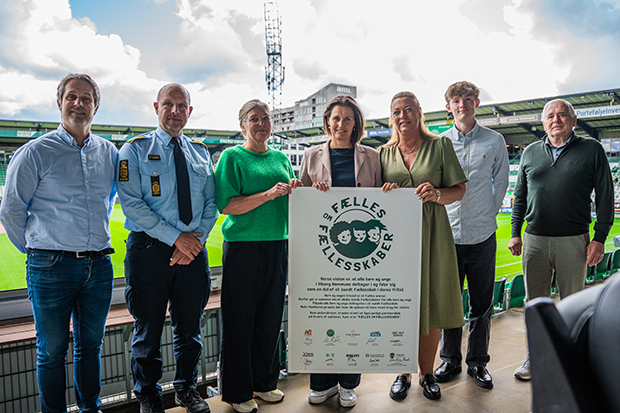 Underskriverne på den nye aftale: Michael Salling, SEC SET ECOFOSS A/S, Henrik Glintborg, Lokalpolitistationen i Viborg, Karen Zacho, Boligselskabernes Fællessekretariat, Katrine Fusager Rohde, formand for Børne- og Ungdomsudvalget, Pernille Cornelius, De Frivilliges Hus, Magnus Vorre, Viborg Ungdomsråd, Preben Jensen, Viborg Idrætsråd. Foto: Viborg FF.