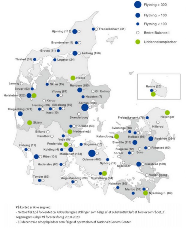 Omkring 4.000 arbejdspladser flyttes fra København. Region Midtjylland får godt 1.000 og Viborg heraf i alt 87. Illustration: Finansministeriet