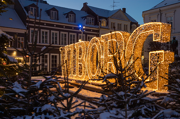 - Hjultorvet med de ikoniske VIBORG-lysbogstaver er en del af julebyen Viborg, som DR besøger i forbindelse med optagelser til “Fællessang synger julen ind” i slutningen af november. Foto: Jesper Maagaard.